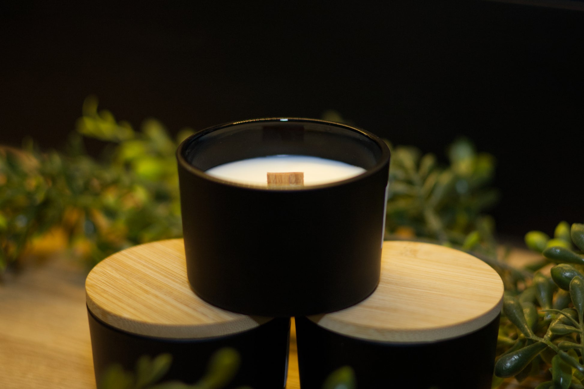 These candle jars come in a matte black container with a wood lid and a wood wick.
